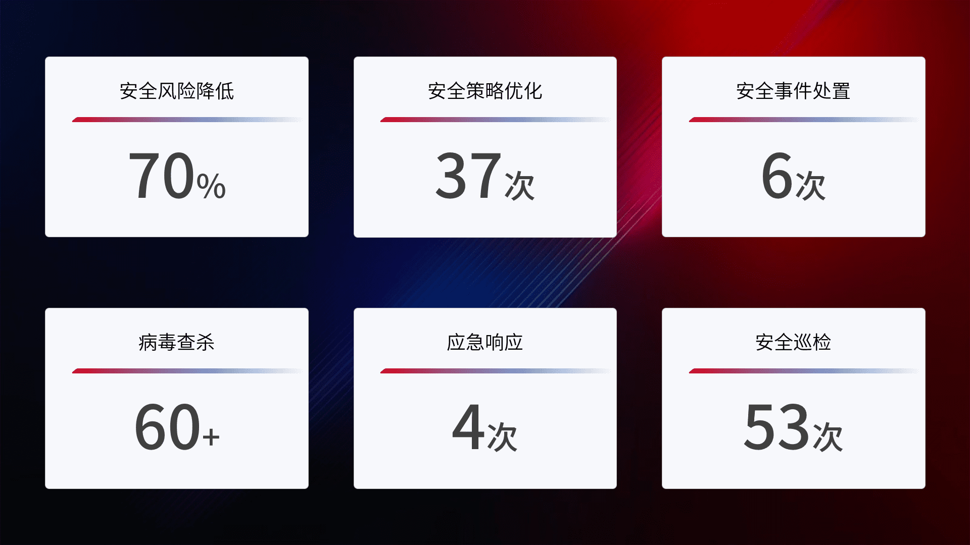 提供全面的安全事件报告体系,,,包括处置报告、、周报、、、季度和年度总结,,结合持续监控,,帮助客户深入了解网络安全状况。。